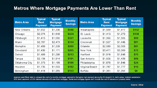 That’s right—according to a recent study from Zillow, in 22 of the 50 largest metro areas, monthly mortgage payments are now lower than rent payments (see chart below)