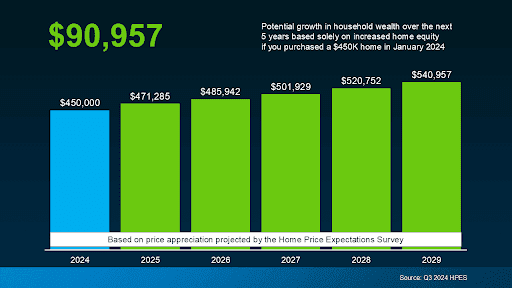 If you bought a $450,000 home at the beginning of this year, based on that starting value and the expert forecasts from the HPES, you could gain more than $90,000 in household wealth over the next five years. That’s significant.